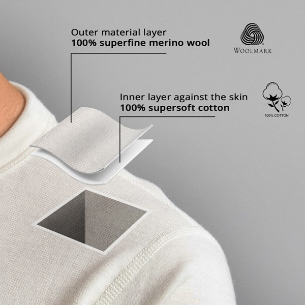 推薦給敏感肌膚,獨特的雙層結構,接觸皮膚的一面內層100%純綿,外層則是100%澳洲純美麗諾羊毛,兩層之間空氣層增加保暖度。天然材質親膚透氣,女裝款兼顧腰身剪裁、輕鬆舒適穿著感。柔軟,耐穿,可洗衣機洗。厚度約為澳洲純羊毛衛生衣厚款,保暖度約為輕薄款。