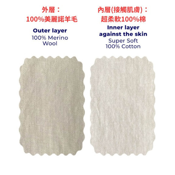 內層採用柔軟的棉質布料貼合肌膚,外層則選用超柔軟的美麗諾羊毛,兼具舒適性和透氣性。
