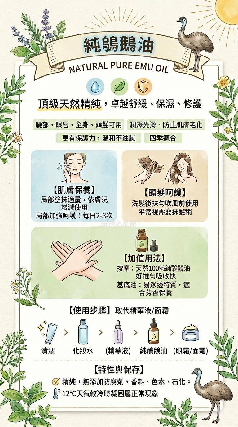 使用步驟流: (取代精華液/面霜) 清潔 > 化妝水 > (精華液) > 純鴯鶓油 > (眼霜/面霜)
